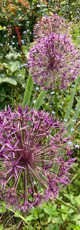 From my bedroom window in the early morning, I can see two huge gum trees and an old oak. And the sky with clouds, glorious sunrises and thick fog. As that is the only time I linger in the room that’s enough. Moving round the house, the bathroom faces west where the architect gave me a floor to ceiling glass window in the shower, the bottom half frosted for modesty, but the top is plain and looks directly at my favourite tree peony Gaugin and a couple of roses and beyond to a hedge of fairy magnolias. The next room to face west is the guest room. This is a calm, quiet room, it has carpet and curtains and non-threatening landscape paintings. (The rest of the house has hard floors of timber and marble, blinds and modern art, not to everyone’s taste – but this is not about the house.) This room has big glass doors onto a sandstone paved courtyard with a birdbath carved to resemble two gingko leaves. It sits in a small bed with blue geranium Rozanne round the base, some Alchemilla mollis and double white Echinacea, also half hidden thyme, and overlooked by a large echium whose blue spires positively sing again the terra cotta wall. Beyond the birdbath a set of stone steps lead to a curved path to the lawn. At the top of the steps, on one side is an ancient crab-apple, opposite is a lemon verbena. The path is edged with hellebores, Solomon’s seal, iris and a not very successful gaura. The lawn slopes up to the big new garden bed, beyond which a huge wedding day rose rambles over the post and rail fence and beyond that are three ornamental cherries in the council strip of verge. And sunsets. Occasionally a new moon when I remember to look. It is the best garden view and I every morning I stand in this room and look out, I can tell from the water level in the birdbath if it has rained overnight. Next time, the front courtyard seen from both the dining and sitting rooms.