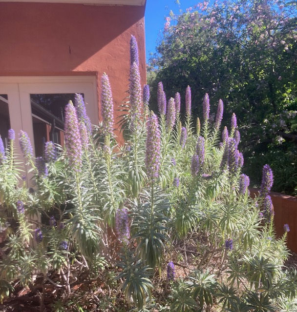 Other blue flowers that make a statement are the Spanish bluebells planted in rings around several trees. They can also spread alarmingly fast and must be dug to be controlled. My current favourite is the award winning blue geranium Rozanne. It is long lasting and a wonderful colour in large or small spaces. It likes almost all positions in the garden and looks after itself, disappearing completely in the winter. Then there are several different blue irises which can fade over time. A blue convolvulus cascades over a wall, grape hyacinths down the drive and patches of ajuga which grows where nothing else will. The street border is agapanthus, planted many years before I came here, and two big clumps of echium up against the house which complement the terra cotta well. There is also a bell flowers, and finally, a ground cover of plants with strappy leaves and a small, bright blue flower I have never been able to identify. All I know is that it was planted by the landscaper 20 years ago and is still going strong. I have twice tried to grow a ceanothus, but it doesn’t like it here. My sister in England had a huge one growing beside her garage and I thought it spectacular, but I must admit I have never seen one in a local garden.
